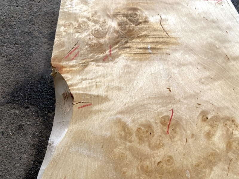| カエデ(楓) 杢 20240417kae 乾燥材荒材 約(28mm)×(400〜460)×(1120)約12Kg ¥9810 | 写真 1 2 3 4 5 6 薄いところで24。虫穴 変色 節 ヒビ 有り東京迄の運賃 税別¥3680 110 |