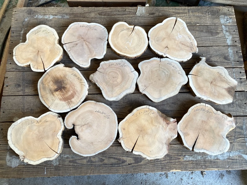 | イチイ(一位) 輪切 20260310wag 乾燥材荒材 約(120〜160mmφ)×(20mm厚)12set 約3Kg ¥2500 | 写真 1 2 3 4 5 6 虫穴 変色 節 ヒビ 有り東京迄の運賃 税別¥1830 77 |