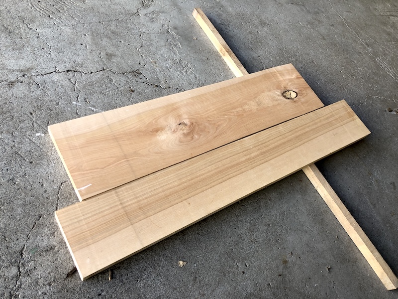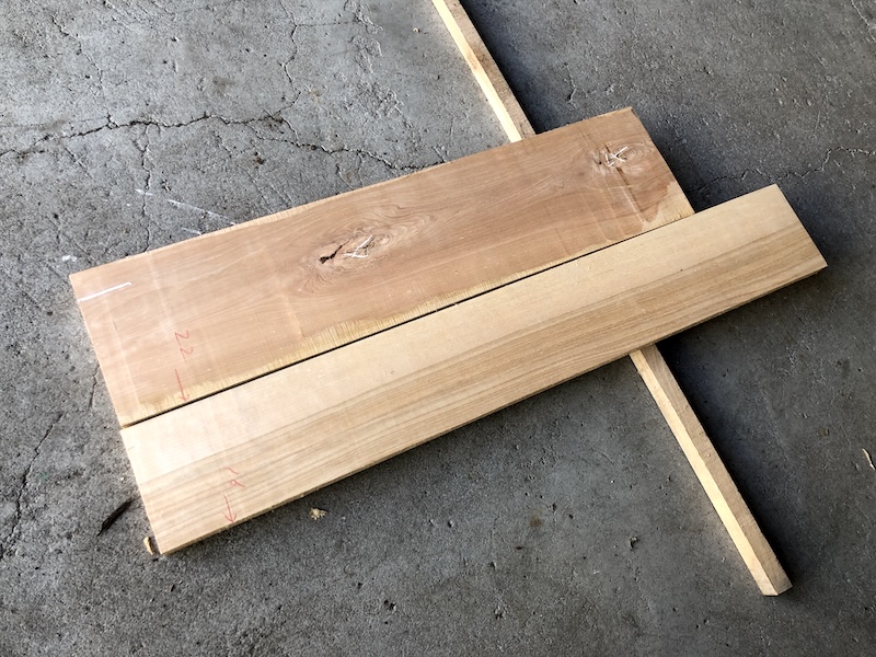 | カバ(樺) 板  20240217kab 乾燥材荒材 約(16mm)×(140〜)×(930)2set 約3Kg ¥2980  |       写真   1  2  3  4  5  6   ロースト板一部焦げてしまったが中身までいい色に染まっています。焦げ臭いです。虫穴 変色 節 ヒビ 釘穴有り東京迄の運賃 税別¥1680 117  |