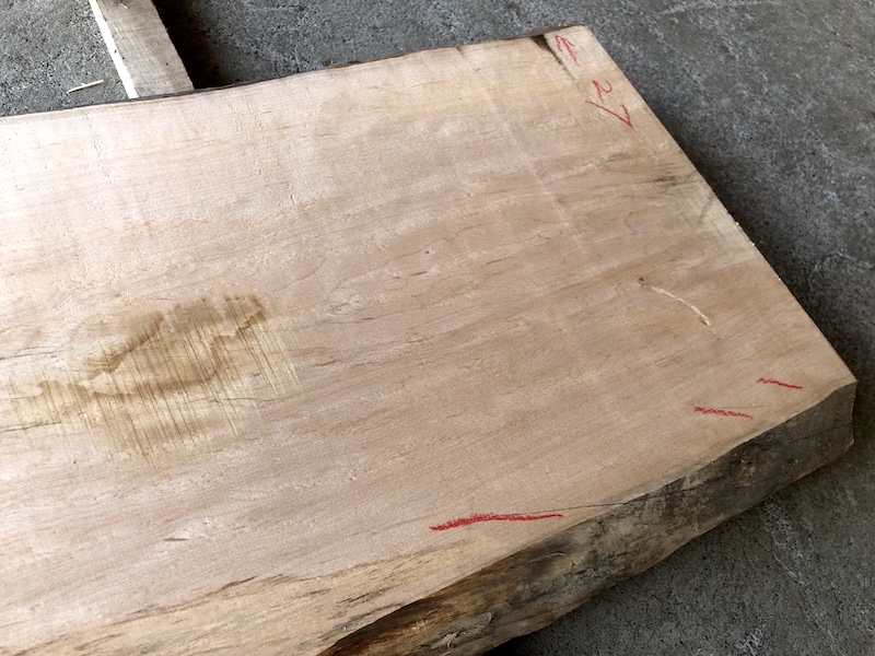 | カエデ(楓) 杢 20241130mok 乾燥材荒材 約(26mm)×(160〜220)×(820)約3Kg ¥4980 | 写真 1 2 3 4 5 6 虫穴 変色 節 ヒビ 有り東京迄の運賃 税別¥1650 120 |